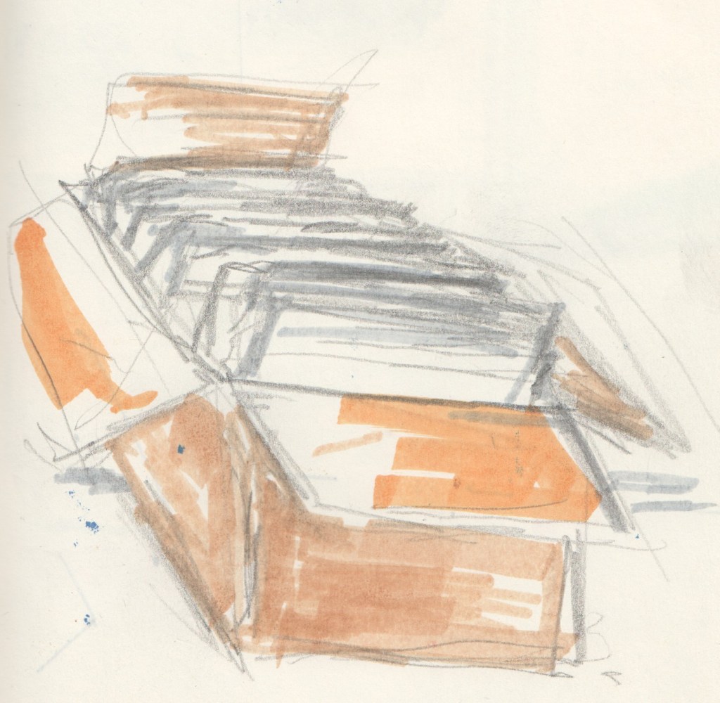Am Ende des Tages habe ich dann doch meinen Beobachtungsposten verlassen. Ich bin mit in den Keller gestiegen und habe mich an einer Kette beteiligt, mit deren Hilfe Kataloge aus einem Kellerraum des Museums auf eine Palette gestapelt werden. Wir geben uns immer 20 bis 30 Kataloge weiter. Ich gehe ein Stück Treppe hinauf übergebe meine Kataloge und gehe dann wieder die Treppe hinunter um neue Kataloge in Empfang zu nehmen. Wo die Palette mit den Katalogen wird an die Nachlasstiftung geschickt. Ich verabschiede mich dann um 18 Uhr während das Umbauteam noch beschäftigt ist.