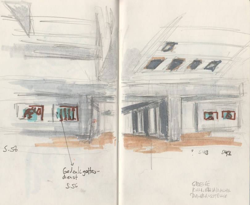 Um der Ausstellung zu folgen, muss ich etwas hinabsteigen. An der Grenzlinie zwischen Sonderausstellung und Dauerausstellung öffnet sich ein Forum, das die Niveauunterschiede zwischen den beiden Austellungstrakten ausgleicht. Rechts und links schließen sich kleinere Kabinette an, in denen weitere Bilder der Fotografin ausgestellt sind. Hinter diesen Kabinetten öffnen sich die Räume der Dauerausstellung. Man kann erkennen, dass deren Exponate in weiteren kleinen Kabinetten präsentiert werden. Es gibt eine zentralperspektivische Durchsicht zu einem abschließenden Saal. Ich habe das Gefühl, dass die Decke auf mir lastet. Der Forumsraum geht in seinen Flügeln in die Breite. Zur Mitte des Forums öffnet sich die Decke in mit einem rechteckigen Winkel nach oben .