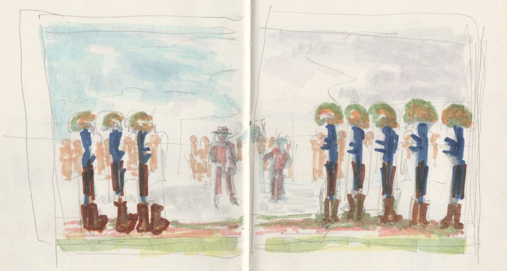 An dieser Grenzlinien zwischen Dauerausstellung und Sonderausstellung beginnen die unterschiedlichen Exponate miteinander ins Gespräch zu kommen. Die Porträts aus den unterschiedlichen Lebensphasen von Kollwitz schauen auf die Vertikalen, die aufgerichtet wurden. Sei es auf die Säulen vor ihnen oder die aufgerichteten Gewehre, die für die namenlosen Soldaten stehen. Die Porträts verbinden sich mit dem Foto eines trauernden Kameraden, der vor den leeren Stiefeln weinend zusammenbricht. Sein Bild hängt links vom „Gedenkgottesdienst“. Kollwitz Porträts reihen sich in die Trauer ein, auch wenn die Anlässe für ihren Gesichtsausdruck ganz andere waren, sei es eine persönliche Depression oder der Verlust des eigene Sohnes.